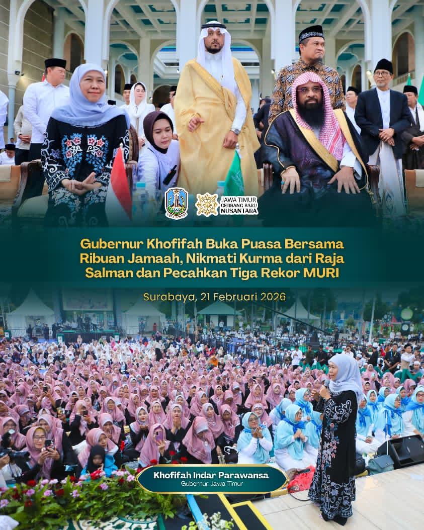SURABAYA, 21 FEBRUARI 2026 – Genap satu tahun kepemimpinan periode 2025–2030, Gubernur Jawa Timur Khofifah Indar Parawansa bersama Wakil Gubernur Emil Elestianto Dardak menyantuni anak yatim dan pengemudi ojek online (ojol) di Gedung Negara Grahadi, Surabaya, Jumat (20/2). Momentum tersebut bertepatan…