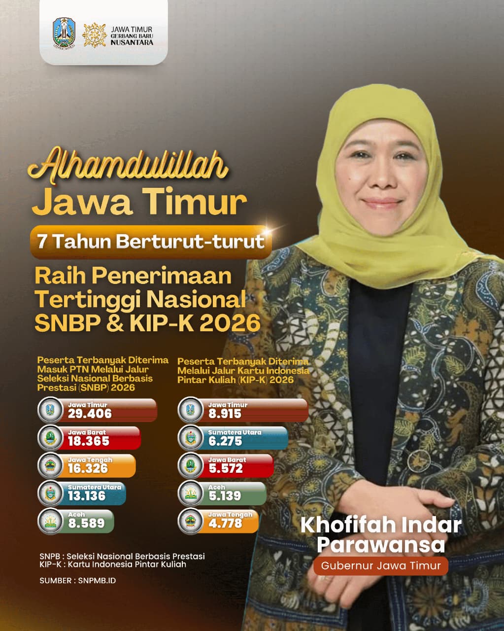 View AllGubernur Khofifah Ungkap 29 Ribu Lebih Siswa Jatim Lolos SNBP 2026, Pertahankan Posisi Tertinggi Nasional