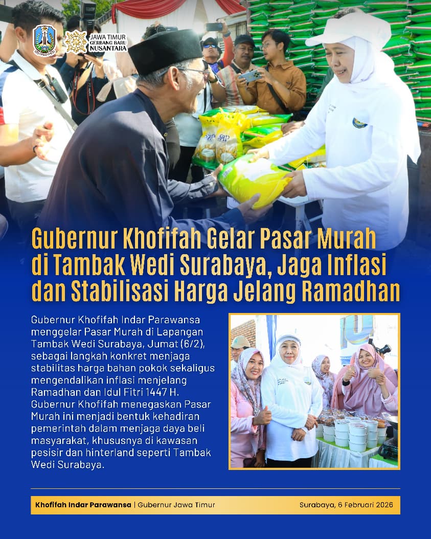 SURABAYA, 7 FEBRUARI 2026 – Gubernur Jawa Timur Khofifah Indar Parawansa menggelar Pasar Murah di Lapangan Tambak Wedi Kec. Kenjeran,…