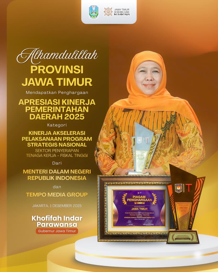 JAKARTA, 2 DESEMBER 2025 – Pemerintah Provinsi Jawa Timur meraih penghargaan sebagai provinsi Penyerapan Tenaga Kerja dengan Fiskal Tinggi pada Malam Apresiasi Kinerja Pemerintahan Daerah Tahun 2025 di Hotel Borobudur Jakarta, Senin (1/12).