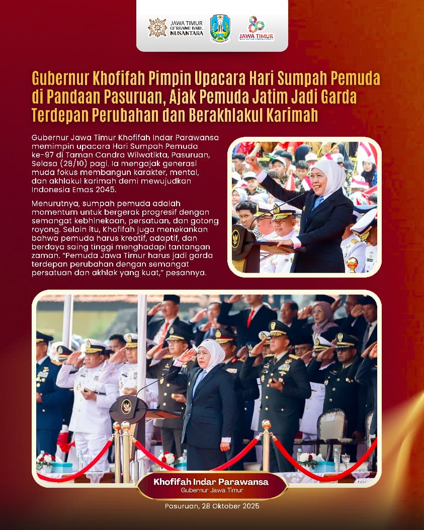 Sebagai informasi, dalam rangkaian Upacara Peringatan Sumpah Pemuda ke-97, Gubernur Khofifah menyerahkan penghargaan kepada Pemuda Pelopor, Pemuda Utama dan Pemuda Inspiratif Jawa Timur Tahun 2025.