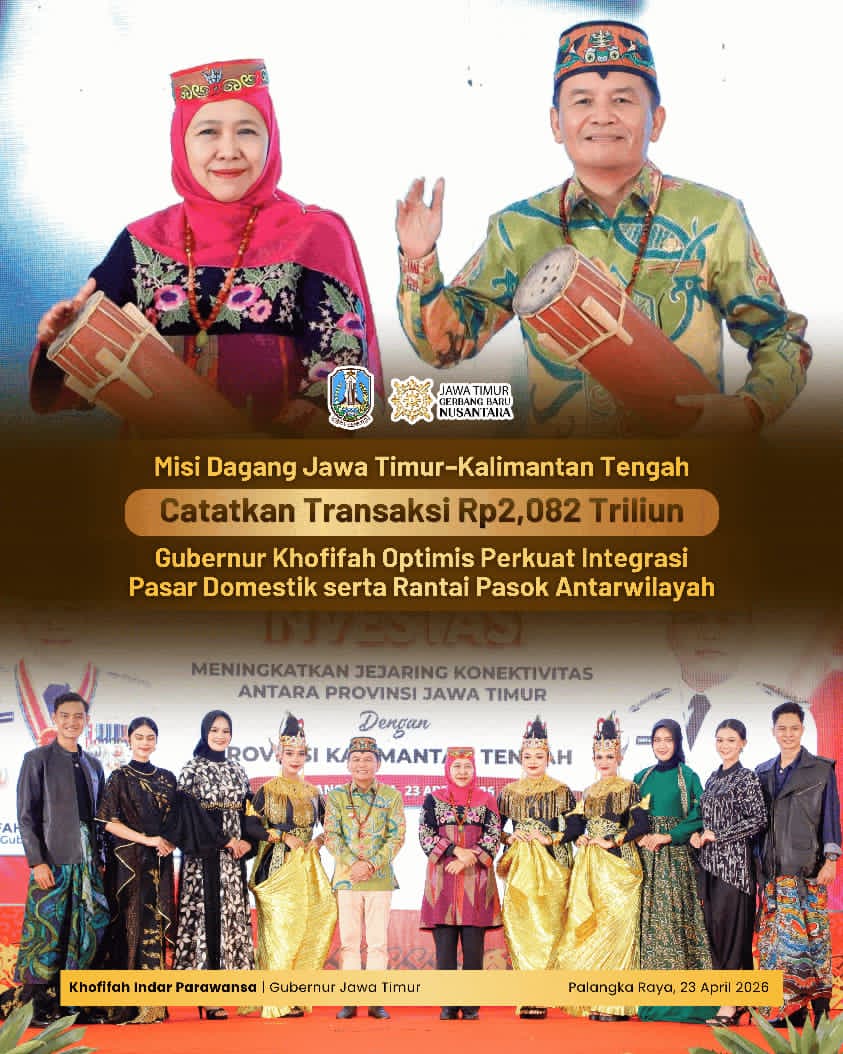 PALANGKA RAYA, 24 APRIL 2026 – Gubernur Jawa Timur Khofifah Indar Parawansa memimpin Misi Dagang dan Investasi Provinsi Jawa Timur ke Kalimantan Tengah yang berhasil membukukan komitmen transaksi final sebesar Rp 2.082.554.327.000 hingga pukul 17.00 WIB. Kegiatan ini digelar di Hotel M Bahalap, Kota Palangka Raya, Kamis (23/4).