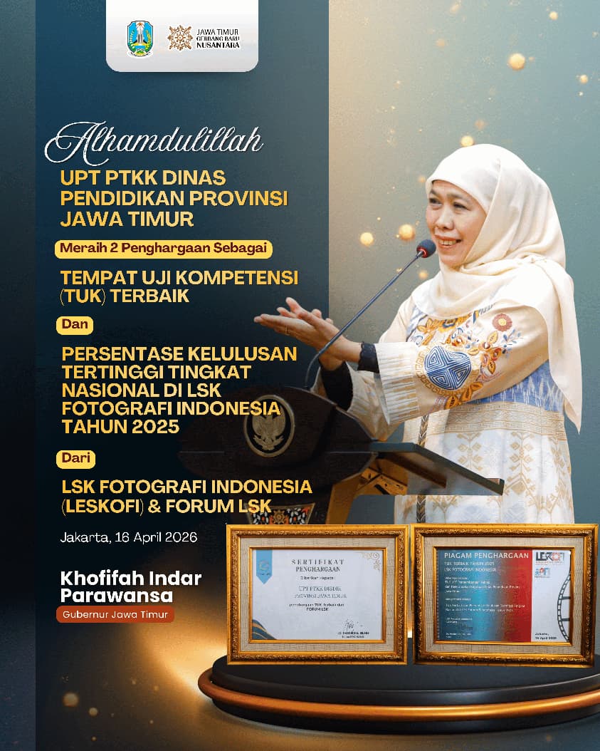 SURABAYA, 20  APRIL 2026 – Gubernur Jawa Timur Khofifah Indar Parawansa menegaskan komitmennya dalam penguatan sumber daya manusia (SDM) vokasi melalui capaian membanggakan Unit Pelaksana Teknis Pengembangan Teknis dan Keterampilan Kejuruan (UPT PTKK) Dinas Pendidikan Provinsi Jawa Timur.
