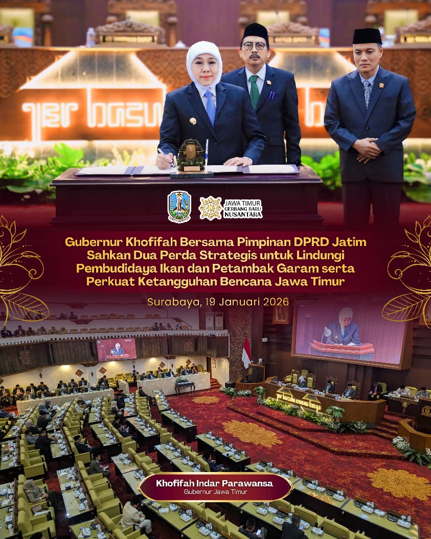 SURABAYA, 20  JANUARI 2026 – Gubernur Jawa Timur Khofifah Indar Parawansa bersama Pimpinan DPRD Jatim resmi mengesahkan dua Peraturan Daerah (Perda) strategis dalam Rapat Paripurna di Gedung DPRD Provinsi Jawa Timur, Senin (19/1).