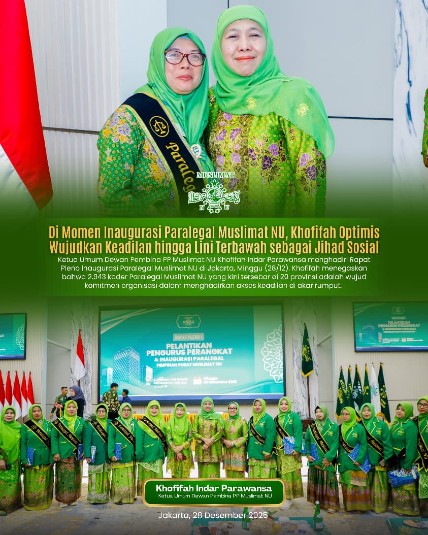 JAKARTA, 29 DESEMBER 2025 – Ketua Umum Dewan Pembina PP Muslimat NU, Khofifah Indar Parawansa secara resmi mengukuhkan jajaran Paralegal Muslimat NU dalam sebuah prosesi inaugurasi yang digelar di Auditorium KH.M. Rasjidi Kementerian Agama RI pada Minggu (28/12).