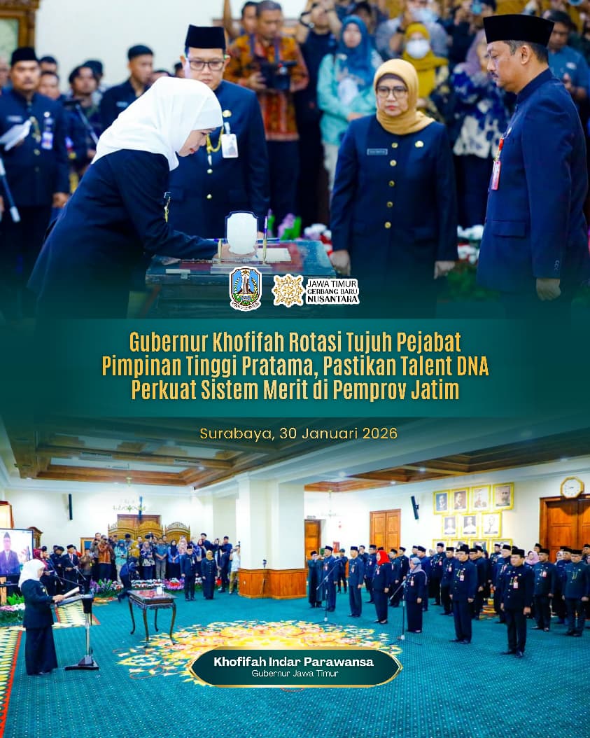 Pesankan Penyelarasan Program Prioritas NasionalSURABAYA, 1 FEBRUARI 2026 – Gubernur Jawa Timur Khofifah Indar Parawansa merotasi tujuh Pejabat Pimpinan Tinggi…