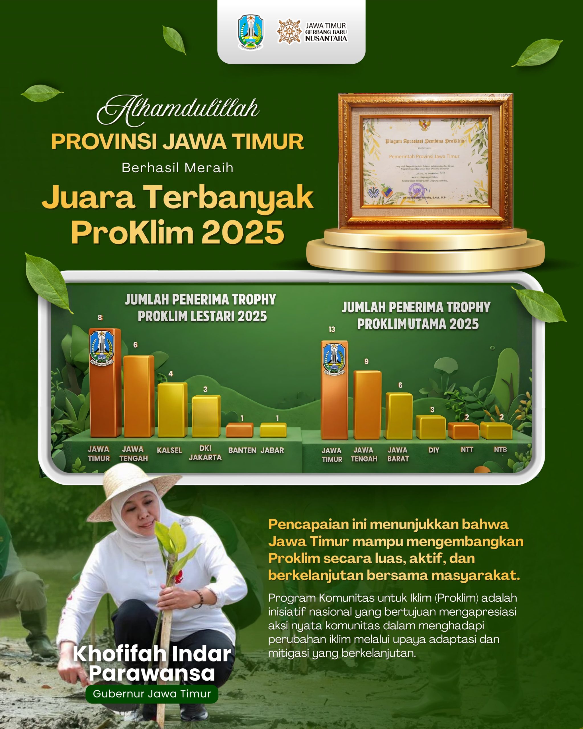 Pemerintah Provinsi Jawa Timur meraih penghargaan Indeks Kualitas Kebijakan (IKK) Award Tahun 2025 untuk kategori provinsi berkualifikasi unggul dari Lembaga Administrasi Negara Republik Indonesia (LAN RI).